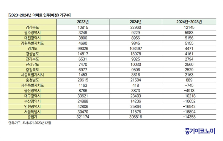 ¿ì¼± °¡Àå ¸¹Àº ¹°·®ÀÇ ¾ÆÆÄÆ®°¡ ÀÔÁÖÇÒ °÷Àº °æ±âµµ´Ù. 10¸¸3497¼¼´ë°¡ °ø±ÞµÈ´Ù. ±× µÚ¸¦ ÀÎõ±¤¿ª½Ã(2¸¸5864°¡±¸), °æ»óºÏµµ(2¸¸2960°¡±¸), ÃæÃ»³²µµ(2¸¸1504°¡±¸)°¡ µû¸£¸ç ÇÑÇØ °¢ 2¸¸ °¡±¸ ÀÌ»ó ÀÔÁÖ¹ÎÀ» ¸ÂÀ» ¿¹Á¤ÀÌ´Ù. °æ»ó³²µµ(1¸¸8978°¡±¸), ºÎ»ê±¤¿ª½Ã(1¸¸4236°¡±¸), ¼¿ïƯº°½Ã(1¸¸1576°¡±¸), Àü¶ó³²µµ(1¸¸30°¡±¸)´Â °¢ 1¸¸ °¡±¸´ë¸¦ °ø±ÞÇÑ´Ù. °¿øÆ¯º°ÀÚÄ¡µµ(9845°¡±¸), ÃæÃ»ºÏµµ(9506°¡±¸), Àü¶óºÏµµ(9325°¡±¸), ±¤ÁÖ±¤¿ª½Ã(9229°¡±¸), ´ëÀü±¤¿ª½Ã(8956°¡±¸), ¿ï»ê±¤¿ª½Ã(3873°¡±¸), ¼¼Á¾Æ¯º°ÀÚÄ¡½Ã(3616°¡±¸), Á¦ÁÖÆ¯º°ÀÚÄ¡µµ(418°¡±¸)´Â ¾ÆÆÄÆ® ÀÔÁÖ¹°·®ÀÌ Áö¿ªº° °¢ 1¸¸È£¿¡ ¹ÌÄ¡Áö ¸øÇϰí ÀÖ´Ù.