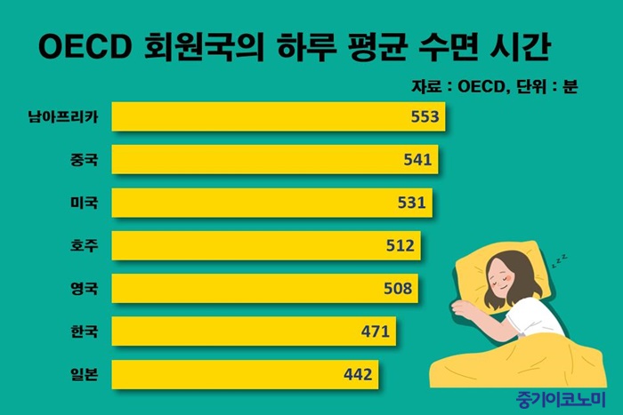 ¿ì¸®³ª¶ó´Â ´ëÇ¥ÀûÀÎ Àá ºÎÁ·±¹°¡´Ù. KB±ÝÀ¶ÁöÁְ濵¿¬±¸¼Ò°¡ ÃÖ±Ù ¹ßÇ¥ÇÑ ¡®µ· µÇ´Â Àá, ½½¸®Æ÷³ë¹Í½º¡¯ º¸°í¼¿¡ µû¸£¸é, ¿ì¸®³ª¶ó ±¹¹ÎÀÇ ÇÏ·ç Æò±Õ ¼ö¸é½Ã°£Àº OECD ȸ¿ø±¹ Áß ÃÖÇÏÀ§ ¼öÁØÀÌ´Ù.