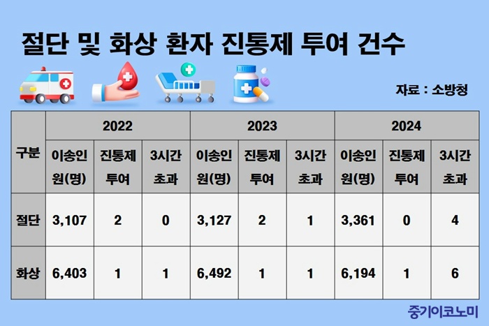 ÃÖ±Ù ±¹È¸ º¸°Çº¹ÁöÀ§¿øÈ¸ ¼Ò¼Ó ±¹¹ÎÀÇÈû ±è¿¹Áö ÀÇ¿øÀÌ ¼Ò¹æÃ»À¸·ÎºÎÅÍ Á¦Ãâ¹ÞÀº ÀÚ·á¿¡ µû¸£¸é, ÃÖ±Ù 3³â°£ ±¸±ÞÂ÷·Î ÀÌ¼ÛµÈ Àý´Ü ȯÀÚ´Â ÃÑ 9595¸íÀ̾úÀ¸³ª ÀÌ¼Û Áß ÁøÅëÁ¦¸¦ Åõ¿©¹ÞÀº »ç·Ê´Â 4°Ç(0.04%)¿¡ ºÒ°úÇß´Ù. ¿¬µµº°·Î´Â 2022³â 3107¸í Áß 2¸í, 2023³â 3127¸í Áß 2¸íÀÌ Åõ¿©¹Þ¾Ò°í, 2024³â¿¡´Â 3361¸í °¡¿îµ¥ ´Ü ÇÑ ¸íµµ ÁøÅëÁ¦¸¦ ¹ÞÁö ¸øÇß´Ù. ƯÈ÷ ÀÌ¼Û ½Ã°£ÀÌ 3½Ã°£ ÀÌ»ó °É¸° ȯÀÚ ´Ù¼öµµ ÅëÁõ ¿ÏÈ Ä¡·á¸¦ ¹ÞÁö ¸øÇÑ °ÍÀ¸·Î ³ªÅ¸³µ´Ù.