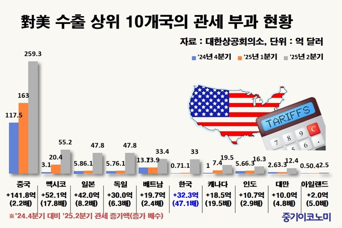 ÀÌ¿¡ µû¸£¸é, Çѱ¹ÀÇ ´ë¹Ì °ü¼¼ Áõ°¡À²Àº Àü³â 4ºÐ±â ´ëºñ 4614%(47.1¹è)·Î 10´ë ¼öÃâ±¹ Áß °¡Àå ³ô¾Ò´Ù. °°Àº ±â°£ ij³ª´Ù(1850%), ¸ß½ÃÄÚ(1681%), ÀϺ»(724%), µ¶ÀÏ(526%) µî°ú ºñ±³Çϸé Å« ÆøÀÌ´Ù.