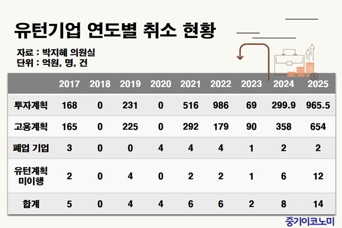 ¿¬µµº° À¯Åϱâ¾÷ Ãë¼Ò ÇöȲÀ» º¸¸é ¡ã2021³â 6°Ç(ÅõÀÚ 516¾ï¿ø¡¤°í¿ë 292¸í) ¡ã2022³â 6°Ç(986¾ï¿ø¡¤179¸í) ¡ã2023³â 2°Ç(69¾ï¿ø¡¤90¸í) ¡ã2024³â 8°Ç(299.9¾ï¿ø¡¤358¸í) ¡ã2025³â 9¿ù ±âÁØ 14°Ç(965.5¾ï¿ø¡¤654¸í)À¸·Î ²ÙÁØÇÑ Áõ°¡¼¼¸¦ º¸À̰í ÀÖ´Ù.