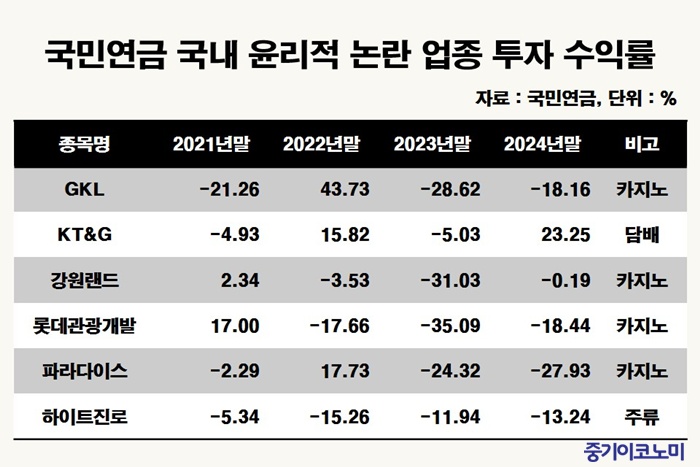 ±¹¹Î¿¬±ÝÀº ÀÌµé ±â¾÷¿¡ ²ÙÁØÈ÷ ÅõÀÚÇØ¿ÔÁö¸¸ ¼öÀÍ·üÀº ºÎÁøÇß´Ù. 2024³â ¸» ±âÁØ KT&G¸¦ Á¦¿ÜÇÑ ³ª¸ÓÁö 5°³ Á¾¸ñ¿¡¼ ¸ðµÎ ¼Õ½ÇÀÌ ¹ß»ýÇßÀ¸¸ç, ƯÈ÷ ÆÄ¶ó´ÙÀ̽ºÀÇ ¼Õ½Ç·üÀº –27.9%¿¡ ´ÞÇß´Ù. °°Àº ÇØ °¿ø·£µå´Â –0.19%, ·Ôµ¥°ü±¤°³¹ßÀº –18.44%, GKLÀº –18.16%, ÇÏÀÌÆ®Áø·Î´Â –13.24%¸¦ ±â·ÏÇÏ¸ç ºÎÁøÇÑ ¼ºÀûÀ» º¸¿´´Ù.