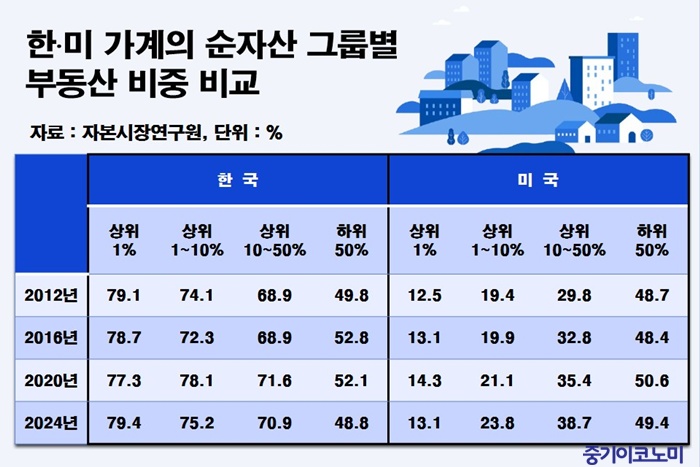 ¼øÀÚ»ê °èÃþº°·Î »ìÆìº¸¸é ÀÌ·¯ÇÑ ±¸Á¶Àû Â÷ÀÌ´Â ´õ¿í ¶Ñ·ÇÇÏ´Ù. Çѱ¹Àº »óÀ§ 1% ºÎÀ¯ÃþÀϼö·Ï ºÎµ¿»ê ºñÁßÀÌ ´õ ³ô¾ÆÁö´Â ¹Ý¸é, ¹Ì±¹Àº ¼øÀÚ»êÀÌ ¸¹À»¼ö·Ï ºÎµ¿»ê ºñÁßÀÌ ³·°í ±ÝÀ¶ÀÚ»ê Áß½ÉÀÇ Æ÷Æ®Æú¸®¿À¸¦ ±¸¼ºÇÏ´Â °æÇâÀ» º¸ÀδÙ. ¿¹¸¦ µé¾î, 2024³â ±âÁØ Çѱ¹ÀÇ »óÀ§ 1% °¡°è´Â ÀÚ»êÀÇ 79.4%¸¦ ºÎµ¿»ê¿¡ º¸À¯Çϰí ÀÖ´Â ¹Ý¸é, ¹Ì±¹ »óÀ§ 1%ÀÇ ºÎµ¿»ê ºñÁßÀº 13.1%¿¡ ºÒ°úÇÏ´Ù.