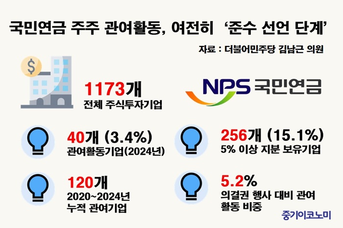 ±è ÀÇ¿øÀÌ ±¹¹Î¿¬±Ý°ø´ÜÀ¸·ÎºÎÅÍ Á¦Ãâ¹ÞÀº ÀÚ·á¿¡ µû¸£¸é, 2020³âºÎÅÍ 2024³â±îÁö ±¹¹Î¿¬±Ý±â±ÝÀº ÃÑ 120°³ ±â¾÷¿¡ ´ëÇØ ÁßÁ¡°ü¸®»ç¾È °ü·Ã ÁÖÁÖ °ü¿©È°µ¿À» ½Ç½ÃÇß´Ù. 2024³â ¸» ±âÁØ °ü¿©È°µ¿ ´ë»ó ±â¾÷Àº 40°³·Î, ÀÌ´Â ±¹¹Î¿¬±ÝÀÌ ÅõÀÚÇÑ 1173°³ »óÀå±â¾÷ ´ëºñ ¾à 3.4%, 5% ÀÌ»ó ÁöºÐ º¸À¯±â¾÷ 265°³ ´ëºñ 15.1%¿¡ ºÒ°úÇß´Ù. °°Àº ÇØ Àǰá±Ç Çà»ç(756ȸ ±âÁØ)¿Í ºñ±³Çصµ ¾à 5.2% ¼öÁØÀÌ´Ù.