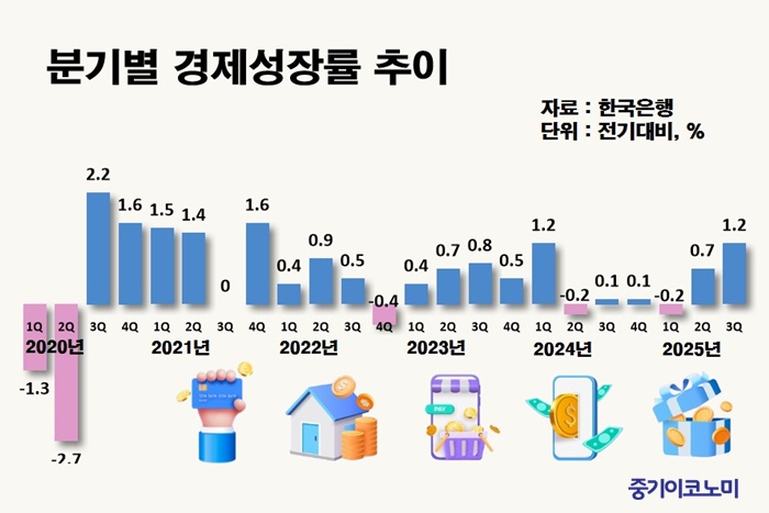 ¿ÃÇØ 3ºÐ±â ¿ì¸®³ª¶ó °æÁ¦°¡ ¹Î°£¼Òºñ¿Í ¼öÃâ ȸº¹¿¡ ÈûÀÔ¾î Àü ºÐ±âº¸´Ù 1.2% ¼ºÀåÇÑ °ÍÀ¸·Î ³ªÅ¸³µ´Ù. Çѱ¹ÀºÇàÀÌ 28ÀÏ ¹ßÇ¥ÇÑ ¡®2025³â 3ºÐ±â ½ÇÁú ±¹³»ÃÑ»ý»ê(¼Óº¸)¡¯¿¡ µû¸£¸é, ½ÇÁú GDP´Â Àü³â °°Àº ±â°£º¸´Ù 1.7% Áõ°¡ÇØ ¿Ï¸¸ÇÑ È¸º¹¼¼¸¦ À̾´Ù. ½ÇÁú ±¹³»ÃѼҵæ(GDI)µµ Àü ºÐ±âº¸´Ù 0.7% ´Ã¾î³ª¸ç ¼Òµæ ¿©°Ç ¿ª½Ã °³¼±µÆ´Ù.