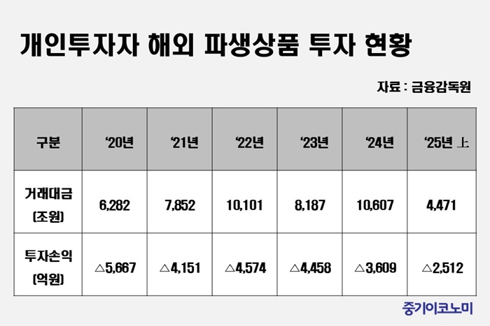 ±Ý°¨¿ø¿¡ µû¸£¸é, °³ÀÎÅõÀÚÀÚÀÇ ÇØ¿Ü ÆÄ»ý»óǰ(¼±¹°¡¤¿É¼Ç) ÅõÀÚ ¼Õ½ÇÀº 2020³âºÎÅÍ 2025³â »ó¹Ý±â±îÁö ¿¬Æò±Õ ¾à 4580¾ï¿ø¿¡ ´ÞÇÑ´Ù.