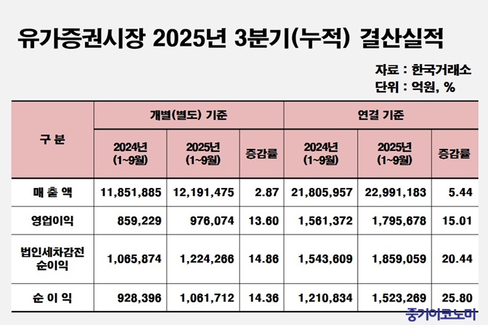 Çѱ¹°Å·¡¼Ò¿Í Çѱ¹»óÀåȸ»çÇùÀÇȸ°¡ 18ÀÏ ¹ßÇ¥ÇÑ 2025³â 3ºÐ±â À¯°¡Áõ±Ç½ÃÀå 12¿ù °á»ê¹ýÀÎÀÇ ½ÇÀûÀ» º¸¸é, ¸ÅÃâ¾×¡¤¿µ¾÷ÀÌÀÍ¡¤¼øÀÌÀÍ ¸ðµÎ Àü³âµ¿±â ´ëºñ Áõ°¡ÇÑ °ÍÀ¸·Î ³ªÅ¸³µ´Ù. ±Û·Î¹ú °æ±â µÐÈ ¼Ó¿¡¼µµ ±¹³» ÁÖ¿ä »óÀå»çÀÇ ¼öÀͼºÀÌ °³¼±µÈ °ÍÀ¸·Î ºÐ¼®µÈ´Ù.
