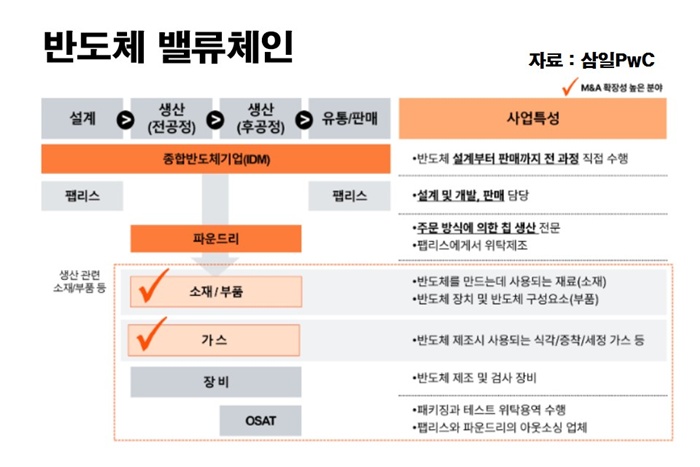 ¡ÞÀü °øÁ¤ ¼ÒÀ硤ºÎǰ¡¤°¡½º°¡ M&A Áß½ÉÃà=¹ÝµµÃ¼ »ê¾÷Àº Á¾ÇչݵµÃ¼(IDM), ÆÕ¸®½º(Fabless), ÆÄ¿îµå¸®(Foundry) ±¸Á¶¸¦ ¹ÙÅÁÀ¸·Î ÀüÈÄ¹æ ±â¾÷µéÀÌ À¯±âÀûÀ¸·Î ¿¬°áµÈ »ýŰ踦 Çü¼ºÇϰí ÀÖ´Ù. »ï¼ºÀüÀÚ¡¤SKÇÏÀ̴нº¡¤ÀÎÅÚó·³ ¼³°è¿Í »ý»êÀ» ¸ðµÎ ¼öÇàÇÏ´Â IDM, ¿£ºñµð¾Æ¡¤Ä÷Äİú °°Àº ¼³°è Àü¹® ÆÕ¸®½º, ±×¸®°í TSMC¡¤»ï¼ºÀüÀÚ ÆÄ¿îµå¸® »ç¾÷ºÎó·³ »ý»ê¿¡ Æ¯ÈµÈ ±â¾÷µéÀÌ Á᫐ ÃàÀ» ÀÌ·é´Ù.