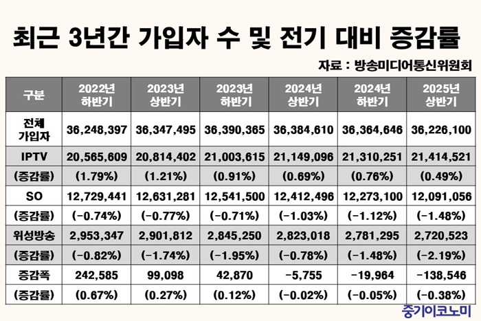 ÃÖ±Ù 3³â°£ ÃßÀ̸¦ º¸¸é, IPTV´Â ²ÙÁØÇÑ ¼ºÀå¼¼¸¦ À¯ÁöÇÑ ¹Ý¸é, SO¿Í À§¼º¹æ¼ÛÀÇ °¡ÀÔÀÚ ÀÌÅ»Àº °è¼ÓµÆ´Ù. SO´Â 2021³â »ó¹Ý±â 37%´ë¿´´ø ½ÃÀåÁ¡À¯À²ÀÌ ¿ÃÇØ »ó¹Ý±â¿¡´Â 33.38%±îÁö ¶³¾îÁ³´Ù. Áß±âÀÌÄÚ³ë¹Ì ä¹Î¼± ±âÀÚ