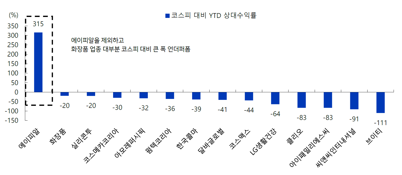 ÈÀåǰ ¾÷Á¾ÀÇ ¿ÃÇØ ¼öÀÍ·üÀÌ ÄÚ½ºÇÇ ¼öÀÍ·üº¸´Ù ¹Øµµ´Â °ÍÀ¸·Î ºÐ¼®µÆ´Ù.±³º¸Áõ±ÇÀº ÈÀåǰ ¾÷Ȳ Á¡°Ë ¸®Æ÷Æ®¸¦ ÅëÇØ 2025³â 11¿ù 21ÀÏ ±âÁØ ±¹³» ÈÀåǰ ¾÷Á¾ÀÇ ¿¬ÃÊ ÀÌÈÄ ¼öÀÍ·ü((YTD)Àº 41.0%·Î, ÄÚ½ºÇÇ ´ëºñ -19.6%Æ÷ÀÎÆ® ¾ð´õÆÛÆû(underperform, ½ÃÀå Æò±ÕÀ» ¹Øµµ´Â ½ÇÀû)À» ±â·ÏÇß´Ù°í ¹àÇû´Ù.¿¡ÀÌÇǾËÀÌ YTD 376%·Î µ¶º¸ÀûÀ¸·Î ÄÚ½ºÇÇ ´ëºñ ¾Æ¿ôÆÛÆû(outperform, ½ÃÀå Æò±ÕÀ» ´É°¡ÇÏ´Â ¼º°ú)ÇÏ¸ç ½Ã°¡ÃÑ¾× 1À§¸¦ ±â·ÏÇßÀ¸³ª, ´ë´Ù¼ö ÈÀåǰ ¾÷ü´Â ODM»ç¡¤´ëÇüºê·£µå¸¦ Æ÷ÇÔÇØ -20%~-110%Æ÷ÀÎÆ® ¾ð´õÆÛÆûÀ» ½ÃÇöÇß´Ù.ÀÌ´Â Å×Å©¡¤¹ÙÀÌ¿À ¾÷Á¾ Áß½ÉÀ¸·Î ÅõÀÚ¼ö±ÞÀÌ ¸ô·È°í, ´ëºÎºÐ »óÀå ÈÀåǰ ±â¾÷µéÀÇ ½ÇÀûÀÌ ±â´ëÄ¡¿¡ ¹Ì´ÞÇÑ ¿µÇâÀÌ Å©´Ù´Â ºÐ¼®ÀÌ´Ù.½Ã°¡ÃѾס¤¿µ¾÷ÀÌÀÍ ÄÁ¼¾¼½º º¯µ¿2025³â ¿µ¾÷ÀÌÀÍ Æò±Õ Àü¸ÁÄ¡ ¿ª½Ã ¿¬ÃÊ ÀÌÈÄ ±âÁØ -36% ÇÏÇâ Á¶Á¤µÆ´Ù.¾÷üº°·Î´Â ¿¡ÀÌÇǾËÀÌ +114% ±â´ëÄ¡ »óÇâÀ» º¸ÀÎ ¹Ý¸é, ´Þ¹Ù(+3%), ÄÚ½º¸ÞÄ«(0%)´Â ¿¬ÃÊ ¼öÁØÀ» À¯ÁöÇß´Ù. ÄÚ½º¸Æ½º(-3%), Çѱ¹Äݸ¶(-7%) µî ´ë´Ù¼ö ±â¾÷ ½ÇÀûÀº ¾àº¸ÇÕ ³»Áö´Â Å« ÆøÀ¸·Î ÇÏÇâ Á¶Á¤µÇ¾ú´Ù. LG»ýȰ°Ç°(-51%), ºêÀÌÆ¼(-30%), ¾ÆÀÌÆÐ¹Ð¸®¿¡½º¾¾(-36%), ¾¾¾Ø¾¾(-37%) µî »óÀ§ ºê·£µåµµ ¾à¼¼¸¦ º¸¿´´Ù.ÇâÈÄ ¸ð¸àÅÒ°ú ±Û·Î¹ú ¼ºÀå Àü¸ÁÅõÀڽɸ®°¡ ¾ÇÈµÈ °¡¿îµ¥ KºäƼ°¡ Àçµµ¾àÇÒ ¸ð¸àÅÒÀº 2026³â¿¡ ÁýÁߵǰí ÀÖ´Ù. ¿ì¼± ¹Ì±¹ ½ÃÀå Á¡À¯À²Àº Çѱ¹ÀÌ 1%Æ÷ÀÎÆ® ÀÌ»ó »ó½ÂÇϸç À¯ÀÏÇÏ°Ô ÀÔÁö¸¦ °ÈÇß°í, ¿ÀÇÁ¶óÀΠä³Î È®´ë°¡ Ãß°¡ ¼ºÀå µ¿·ÂÀ¸·Î ÀÛ¿ëÇÒ Àü¸ÁÀÌ´Ù.À¯·´¡¤Áßµ¿¡¤Áß³²¹Ì µî ½Å±Ô ¼öÃâ Áö¿ªÀÇ ¼ºÀåµµ ¶Ñ·ÇÇÏ´Ù. 2024³â ±âÁØ ÁÖ¿ä 3°³ ½Å±Ô Áö¿ª ÇÕ»ê ¼öÃâ¾×Àº ÀÌ¹Ì ¹Ì±¹°ú À¯»çÇÑ ¼öÁØÀ» È®º¸ÇÏ¿´°í, 2025³â¿¡´Â ¹Ì±¹ ´ëºñ ¾à 30% ³ôÀº ¼ºÀåÀÌ ±â´ëµÈ´Ù.ÃÖ±Ù Áß±¹-ÀϺ» °¥µî ½ÉÈ´Â Çѱ¹ ºê·£µå¿¡ ±âȸ ¿äÀÎÀÌ µÇ°í ÀÖ´Ù. ÀϺ» ÈÀåǰÀÇ Áß±¹ ³» Á¡À¯À² ¾àȰ¡ Çѱ¹ ¾÷üÀÇ Ãß°¡ ½ÃÀå È®º¸·Î À̾îÁö°í ÀÖ´Ù. ¼öÃâ µ¥ÀÌÅÍ µÐÈ(2025³â YTD +10%, 2024³â +20%)´Â ÁÖ·Î Áß±¹ ¿µÇâ¿¡ ±âÀÎÇϸç, ºñÁß±¹Çâ Àεðºê·£µå ¼öÃâÀº 2025³â YTD +22%·Î °ßÁ¶ÇÑ È帧À» À¯Áö ÁßÀÌ´Ù. Áß±âÀÌÄÚ³ë¹Ì ±èÇö¼º ±âÀÚ