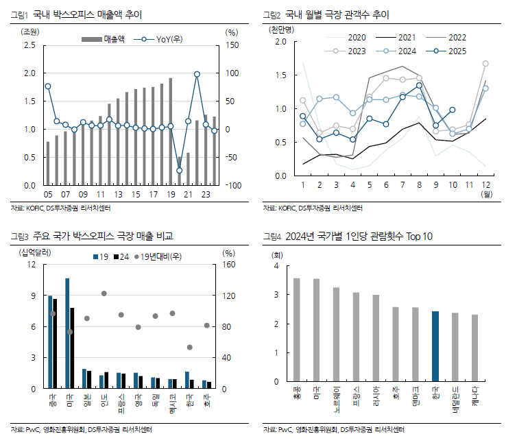 DSÅõÀÚÁõ±ÇÀº CJ CGVÀÇ 2026³â ½ÇÀûÀ» ¿¬°á ¸ÅÃâ¾× 2.3Á¶¿ø(+5 % YoY), ¿µ¾÷ÀÌÀÍ 1,333¾ï¿ø(+1 44 % YoY, OPM 5.7)À¸·Î ÅϾî¶ó¿îµå¸¦ Àü¸ÁÇß´Ù. ±¹³» ¿µÈ°ü °ü°´ ¼ö´Â 2019³â ´ëºñ ¾ÆÁ÷ ¿ÏÀü ȸº¹´Ü°è´Â ¾Æ´Ï¾úÁö¸¸, 2024³â ÀÌÈÄ Á¡ÁøÀûÀΠȸº¹¼¼¸¦ º¸¿´°í, CJ CGVÀÇ ½ÃÀåÁ¡À¯À²Àº 30% Áß¹Ý ¼öÁØÀ» À¯ÁöÇß´Ù°í ºÐ¼®Çß´Ù. CJ CGV´Â ±¹³»¿Ü ¸ÖƼÇ÷º½º ±ØÀå »ç¾÷À» ±â¹ÝÀ¸·Î ÄÜÅÙÃ÷ À¯Åë, ±¤°í, F&B, ±×¸®°í ÀÚȸ»ç 4DPLEX(±â¼úƯº°°ü ÄÜÅÙÃ÷Ç÷§Æû)¸¦ Æ÷ÇÔÇÑ ºÎ°¡»ç¾÷À» °áÇÕÇÑ ¡®Beyond Movies¡¯ Àü·«À» ÃßÁøÇؿ º¹ÇÕ ¿£ÅÍÅ×ÀÎ¸ÕÆ® ±â¾÷ÀÌ´Ù.¸®Æ÷Æ®¿¡ µû¸£¸é, OTT ½ÃÀåÀº 2020³â ÀÌÈÄ °í¼ºÀåÀ» À̾Áö¸¸, PwC ÀÚ·á ±âÁØ 2024³â ÀÌÈÄ ¼ºÀå·üÀÌ µÐȵǴ ¹Ý¸é ±ØÀå °ü¶÷°´ ¼ö¿Í ¸ÅÃâÀº ¹Ù´ÚÀ» Åë°úÇÑ ÀÌÈÄ ¿Ï¸¸ÇÑ È¸º¹ ±¹¸é¿¡ ÁøÀÔÇÑ °ÍÀ¸·Î ºÐ¼®µÆ´Ù. DSÅõÀÚÁõ±ÇÀº OTT¿Í ±ØÀåÀÌ ´ëüÀ纸´Ù´Â º¸¿ÏÀç °ü°è·Î ÀçÁ¤¸³µÇ´Â °úÁ¤¿¡¼ ºí·Ï¹ö½ºÅÍ À§ÁÖÀÇ »ó¿µ, ÇÁ¸®¹Ì¾ö Æ÷¸Ë È®´ë, ±Û·Î¹ú µ¿½Ã°³ºÀ µîÀÌ CJ CGVÀÇ ¼öÀͼº °³¼±¿¡ ±â¿©Çß´Ù°í Æò°¡Çß´Ù. ÅõÀÚ Æ÷ÀÎÆ®·Î´Â ù°, 4DPLEX¸¦ Æ÷ÇÔÇÑ ±Û·Î¹ú ÇÁ¸®¹Ì¾ö Æ÷¸Ë(4DX, ScreenX, SX)ÀÇ °í¼ºÀå, µÑ°, Á¼® È¿À² °³¼±, ¼Â°, ºñ¿ë ±¸Á¶ ÀçÆí¿¡ µû¸¥ ¿µ¾÷ ·¹¹ö¸®Áö È¿°ú¸¦ ²Å¾Ò´Ù.4DPLEX´Â CJ CGVÀÇ ÇÙ½É ¼ºÀåÃàÀ¸·Î Á¦½ÃµÆ´Ù. 4DX¿Í ScreenX¸¦ ÇÕ»êÇÑ 4DPLEXÀÇ ½ºÅ©¸° ¼ö´Â 2019³âºÎÅÍ 2024³â±îÁö ¿¬Æò±Õ 30% ÀÌ»ó Áõ°¡Çß°í, 2024³â ±âÁØ ´©Àû ¼³Ä¡ ½ºÅ©¸°Àº ¾à 928°³, °è¾à ±âÁØ 1152°³ ¼öÁØÀ¸·Î Áý°èµÆ´Ù. DSÅõÀÚÁõ±ÇÀº 4DX¡¤ScreenX°¡ ºÏ¹Ì AMC, ¸ß½ÃÄÚ Cinepolis, ¹Ì±¹ Cinemark µî ±Û·Î¹ú »óÀ§ üÀΰúÀÇ ÆÄÆ®³Ê½ÊÀ» ÅëÇØ 2030³â±îÁö ¾à 7400°³ ½ºÅ©¸°À¸·Î È®´ëµÉ ¼ö ÀÖ´Â ÀáÀç·ÂÀÌ ÀÖ´Ù°í Æò°¡Çß´Ù.½ÇÀû ¹× ¹ë·ù¿¡ÀÌ¼Ç Àü¸Á, ¸ñÇ¥ÁÖ°¡ 8000¿ø Á¦½ÃÀ繫 Ãø¸é¿¡¼ ¸®Æ÷Æ®´Â CJ CGVÀÇ ¼ÕÀͱ¸Á¶ °³¼± ¼Óµµ¸¦ ±¸Ã¼ÀûÀ¸·Î Á¦½ÃÇß´Ù. 2025³â¿¡´Â ¸ÅÃâ 2Á¶2213¾ï¿ø, ¿µ¾÷ÀÌÀÍ 550¾ï¿ø, 2026³â¿¡´Â ¸ÅÃâ 2Á¶3407¾ï¿ø, ¿µ¾÷ÀÌÀÍ 1330¾ï¿ø, ¿µ¾÷ÀÌÀÍ·ü 5.7%°¡ Àü¸ÁµÆ´Ù.EBITDA ±âÁØÀ¸·Î´Â 2022³â 2530¾ï¿ø, 2023³â 3480¾ï¿ø, 2024³â 3550¾ï¿øÀÌ ÃßÁ¤µÆ°í, 2025³â 550¾ï¿ø¿¡¼ 2026³â 1330¾ï¿øÀ¸·Î Àçµµ¾àÇÒ °ÍÀ¸·Î Á¦½ÃµÆ´Ù.¸®Æ÷Æ®¿¡ µû¸£¸é, CJ CGVÀÇ ÀÚ±âÀÚº»ÀÌÀÍ·ü(ROE)Àº 2022³â -55.2%, 2023³â -24.1%, 2024³â -30.7%·Î ÀûÀÚ ±¸°£ÀÌ Áö¼ÓµÆÀ¸³ª, 2025³â -17.0%, 2026³â -3.2%±îÁö ¼Õ½Ç ÆøÀÌ Ãà¼ÒµÉ °ÍÀ¸·Î Àü¸ÁµÆ´Ù. ÁÖ´ç¼øÀÌÀÍ(EPS)Àº 2022³â -2371¿ø, 2023³â -786¿ø, 2024³â -1033¿ø, 2025³â -658¿ø, 2026³â -112¿øÀ¸·Î ÀûÀÚ ÆøÀÌ ÇØ¸¶´Ù ÁÙ¾îµå´Â È帧À» Á¦½ÃÇß´Ù.DSÅõÀÚÁõ±ÇÀº ¹ë·ù¿¡ÀÌ¼Ç »êÃâ¿¡ EV/EBITDA¿Í SOTP ¹æ½ÄÀ» Ȱ¿ëÇß´Ù. 2026³â ¿¬°á EBITDA 1006¾ï¿øÀ» ±âÁØÀ¸·Î ÇÑ EV/EBITDA, ±×¸®°í ÇØ¿Ü »óÀå»ç¿ÍÀÇ ¸ÖƼÇà ºñ±³¸¦ ÅëÇØ CJ CGV º»Ã¼, Áß±¹¡¤ÅÍŰ ¹ýÀÎ, 4DPLEX, CGVFX µîÀ» °¢°¢ Æò°¡Çß°í, ÇÕ»ê ±â¾÷°¡Ä¡¸¦ 7240¾ï¿øÀ¸·Î »êÃâÇß´Ù. ¿©±â¿¡ »óÀå»ç AMC, CGI, 4DPLEXÀÇ ¸ÖƼÇÃÀ» ÂüÁ¶ÇØ 4DPLEX °¡Ä¡¸¸ ¾à 2304¾ï¿ø, CJ CGV º»Ã¼¿Í ÇØ¿Ü ¹ýÀÎ °¡Ä¡¸¦ ÇÕ»êÇØ 4444¾ï¿ø ¼öÁØÀ¸·Î Æò°¡Çß°í, ÃÑ ÀÚ±âÀÚº»°¡Ä¡¸¦ 2778¾ï¿ø, ÁÖ´ç ÀûÁ¤°¡Ä¡¸¦ 8000¿øÀ¸·Î Á¦½ÃÇß´Ù.2025³â 11¿ù 25ÀÏ ±âÁØ CJ CGVÀÇ ÁÖ°¡´Â 5540¿øÀ̾ú°í, ¸ñÇ¥ÁÖ°¡ 8000¿ø ´ëºñ »ó½Â¿©·ÂÀº ¾à 44.4%·Î °è»êµÆ´Ù. DSÅõÀÚÁõ±ÇÀº ´Ü±â ½ÇÀû º¯µ¿¼º¿¡µµ ºÒ±¸Çϰí 4DPLEX ¼ºÀå°ú ¿µÈ½ÃÀå ±¸Á¶ º¯È¿¡ µû¸¥ ·¹¹ö¸®Áö È¿°ú¸¦ ÀÌÀ¯·Î ¡®¸Å¼ö¡¯ ÀǰßÀ» À¯ÁöÇß´Ù°í ¹àÇû´Ù. Áß±âÀÌÄÚ³ë¹Ì ±èÇö¼º ±âÀÚ