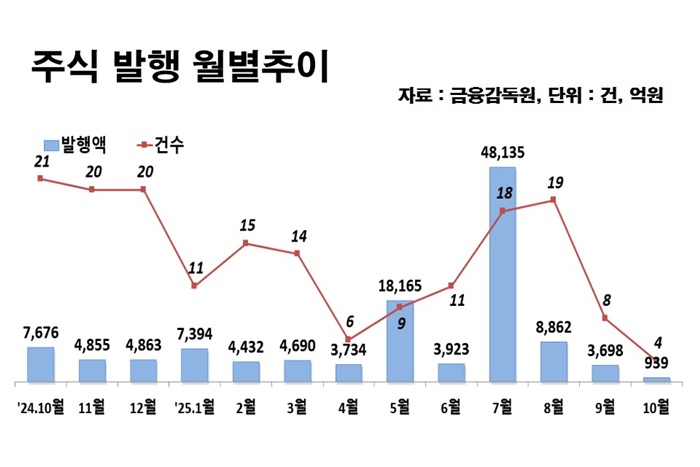 ÁÖ½Ä ¹ßÇàÀº ±â¾÷°ø°³¿Í À¯»óÁõÀÚ°¡ ¸ðµÎ ºÎÁøÇß´Ù. 10¿ù ÁÖ½Ä ¹ßÇàÀº ÃÑ 4°Ç, 939¾ï¿øÀ¸·Î Àü¿ù ´ëºñ 74.6% °¨¼ÒÇß´Ù. IPO´Â ¸ðµÎ ÄÚ½º´Ú »óÀå ¸ñÀûÀÇ ¼Ò±Ô¸ð °ø¸ð·Î ÀÌ·ïÁ³À¸¸ç, Æò±Õ ¹ßÇà ±Ô¸ð°¡ 262¾ï¿øÀ¸·Î Àü¿ù ´ëºñ Å©°Ô ÀÛ¾ÆÁ³´Ù. À¯»óÁõÀÚ ¿ª½Ã 2°Ç, 415¾ï¿ø¿¡ ±×ÃÄ Àü¿ù ´ëºñ 67.3% ÁÙ¾ú´Ù.