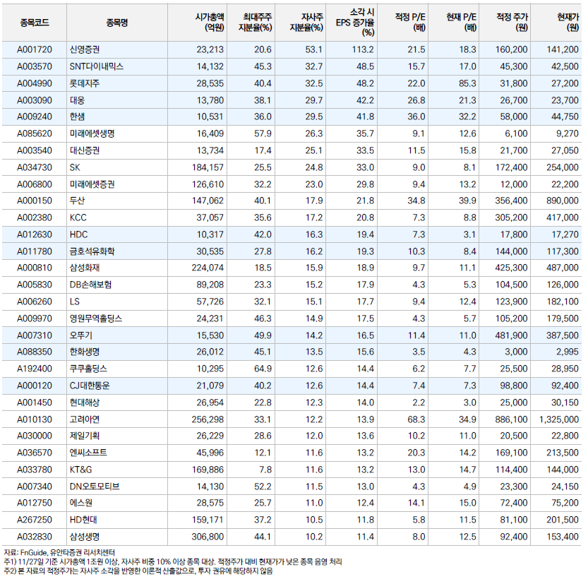 Áö³ 11¿ù25ÀÏ ÀÚ»çÁÖ ¼Ò°¢ Àǹ«È¸¦ ´ãÀº 3Â÷ »ó¹ý °³Á¤¾ÈÀÌ ¹ßÀÇµÇ¸é¼ ÀÚ»çÁÖ ¼Ò°¢ Àǹ«È °¡À̵å¶óÀÎÀÌ ÇÑÃþ ±¸Ã¼ÈµÆ´Ù.°³Á¤¾ÈÀº ½Å±Ô·Î ÃëµæÇÏ´Â ÀÚ»çÁÖ´Â 1³â ¾È¿¡, ±âÁ¸¿¡ º¸À¯ÇÏ´ø ÀÚ»çÁÖ´Â ¹ý ½ÃÇà ÈÄ 6°³¿ù À¯¿¹±â°£À» °ÅÃÄ 1³â ¾È¿¡ Àǹ«ÀûÀ¸·Î ¼Ò°¢Çϵµ·Ï ÇÏ´Â ³»¿ëÀ» ´ã¾Ò´Ù.¶Ç ±âÁ¸¿¡ º¸À¯ÇÑ ÀÚ»çÁÖ¸¦ Ȱ¿ëÇÑ ±³È¯»çä ¹ßÇàÀ» ±ÝÁöÇØ, ÀÚ»çÁÖ¸¦ ÀÌ¿ëÇÑ °æ¿µ±Ç ¹æ¾î ¼ö´ÜÀ» Á¦ÇÑÇÏ´Â ¹æÇâÀ¸·Î Á¦µµ¸¦ ¼³°èÇß´Ù.À¯¾ÈŸÁõ±Ç ¸®Æ÷Æ®¿¡ µû¸£¸é, ÀÚ»çÁÖ ¼Ò°¢ Àǹ«È´Â ÁÖ½Ä ¼ö °¨¼Ò¸¦ ÅëÇØ ÁÖ´ç¼øÀÌÀÍ(EPS)À» ²ø¾î¿Ã¸®°í, ÀÌ EPS »ó½ÂÀº °á°úÀûÀ¸·Î ÁÖ°¡¼öÀͺñÀ²(P/E) Ç϶ôÀ¸·Î ¿¬°áµÈ´Ù.¸®Æ÷Æ®´Â ÀÚ»çÁÖ ¼Ò°¢ ¸ð¸àÅÒÀÌ º»°ÝȵDZâ ÀüÀÎ 3¿ù ¸» ±âÁØ P/E¸¦ Ãâ¹ßÁ¡À¸·Î »ï¾Æ, °¢ ±â¾÷ÀÌ ÀÚ»çÁÖ¸¦ ¾ó¸¶³ª ¼Ò°¢ÇÏ´À³Ä¿¡ µû¶ó P/E°¡ ´Ù½Ã ±âÁ¸ ¼öÁØÀ¸·Î ÀçÆò°¡µÈ´Ù°í °¡Á¤Çß´Ù. ÀÌ °¡Á¤À» ¹ÙÅÁÀ¸·Î ¼Ò°¢ ±Ô¸ðº°·Î ¿¹»óµÇ´Â P/E Á¤»óȸ¦ ÁÖ°¡¿¡ ¹Ý¿µÇØ, ÀÚ»çÁÖ ¼Ò°¢ Á¤Ã¥¿¡ µû¸¥ ±â¾÷º° ÀûÁ¤ ÁÖ°¡¸¦ »êÃâÇÑ °ÍÀÌ À̹ø ºÐ¼®ÀÇ ÇÙ½ÉÀÌ´Ù.¿¹¸¦µé¾î À§ÀÇ Ç¥¿Í °°ÀÌ ½Å¿µÁõ±ÇÀº ÇöÀç°¡ 14¸¸1,200¿ø¿¡ ÀûÁ¤ÁÖ°¡ 16¸¸200¿øÀ», ´ë¿õÀº ÇöÀç°¡ 2¸¸3,700¿ø¿¡ ÀûÁ¤ÁÖ°¡ 2¸¸6,700¿øÀ» Á¦½ÃÇß´Ù. Áß±âÀÌÄÚ³ë¹Ì ±èÇö¼º ±âÀÚ