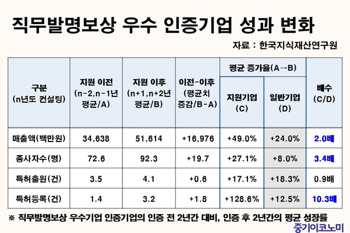 º¸°í¼¿¡ µû¸£¸é, Á÷¹«¹ß¸í ¿ì¼ö ÀÎÁõÀ» ¹ÞÀº ±â¾÷Àº ÀÏ¹Ý ±â¾÷¿¡ ºñÇØ ¸ÅÃâ ¼ºÀå·ü°ú °í¿ë ¼ºÀå·üÀÌ °¢°¢ ¾à 2¹è, ¾à 3.4¹è ³ôÀº °ÍÀ¸·Î ºÐ¼®µÆ´Ù. ÀÌµé ±â¾÷Àº ¿ì¼±½É»ç, ¼ö¼ö·á °¨¸é µî Àμ¾Æ¼ºê¸¦ ÅëÇØ ÀÏ¹Ý ´ëºñ ¾à 10¹è ¸¹Àº ƯÇ㸦 µî·ÏÇÏ´Â µî Çõ½Å Ȱµ¿ÀÌ µÎµå·¯Áø °ÍÀ¸·Î ³ªÅ¸³µ´Ù.