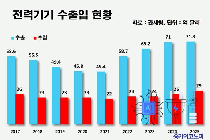 »ý»êµÈ Àü±â¸¦ º¯È¯¡¤°ø±ÞÇÏ´Â º¯¾Ð±âÀÇ ¼ºÀå¼¼´Â ´õ¿í °¡ÆÄ¸£´Ù. º¯¾Ð±â ¼öÃâ¾×Àº 23¾ï 2600¸¸ ´Þ·¯·Î Àü³â ´ëºñ 17.5%³ª ±ÞÁõÇß´Ù. ÀÌ´Â ³ëÈÄ Àü·Â¸Á ±³Ã¼ ¼ö¿ä¿Í AI µ¥ÀÌÅͼ¾ÅÍ È®ÀåÀÌ ¸Â¹°¸° °á°ú·Î ºÐ¼®µÈ´Ù. Á¤Àü ¹æÁö µî¿¡ ÇʼöÀûÀÎ Á¢¼Ó¡¤Â÷´Ü±â ¶ÇÇÑ 14¾ï 7600¸¸ ´Þ·¯¸¦ ¼öÃâÇϸç 7.1%ÀÇ ¼ºÀå·üÀ» ±â·ÏÇØ È£Á¶¼¼¸¦ À̾´Ù.