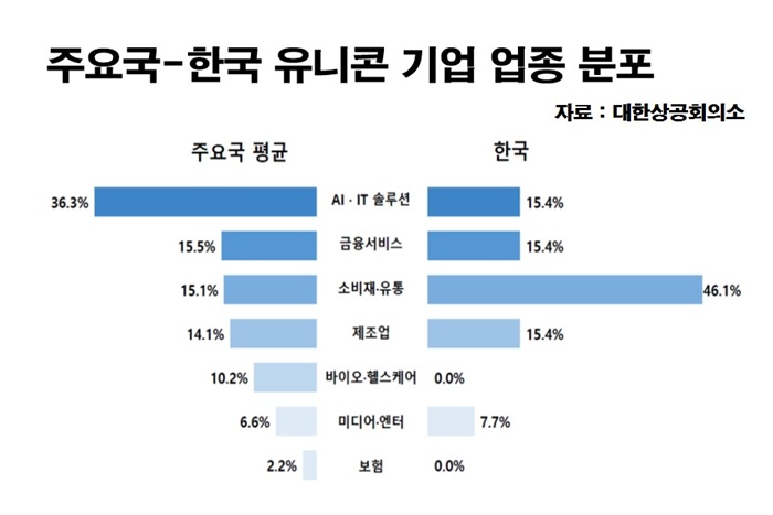 »ê¾÷ ±¸¼º¿¡¼µµ Â÷À̰¡ ¶Ñ·ÇÇß´Ù. ÁÖ¿ä 10°³±¹ À¯´ÏÄÜÀÇ 36.3%°¡ AI¡¤IT ¼Ö·ç¼Ç ºÐ¾ß¿¡ ÁýÁßµÈ ¹Ý¸é, Çѱ¹Àº ¼ÒºñÀ硤À¯Åë ºÐ¾ß°¡ 46.1%·Î Àý¹Ý¿¡ °¡±î¿ü´Ù. ±Û·Î¹ú °æÀïÀÌ Ä¡¿ÇÑ AI¡¤IT ºÐ¾ß¿¡¼ Çѱ¹ÀÇ À¯¸Á ½ºÅ¸Æ®¾÷ÀÌ ºÎÁ·ÇÏ´Ù´Â ÁöÀûÀÌ ³ª¿Â´Ù.