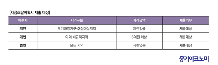 ±¸Ã¼ÀûÀ¸·Î º¸¸é, ÀÚ±ÝÁ¶´Þ°èȹ¼ Á¦Ãâ´ë»óÀº Áö¿ª°ú ±Ý¾× ±×¸®°í °Å·¡ÁÖü¿¡ µû¶ó ´Þ¶óÁø´Ù. Áö¿ªÀº Å©°Ô ±ÔÁ¦Áö¿ª°ú ºñ±ÔÁ¦Áö¿ªÀ¸·Î ³ª´² º¸¾Æ¾ß ÇÑ´Ù. ±ÔÁ¦Áö¿ª³» ÁÖÅÃÀ» ÃëµæÇÒ °æ¿ì Ãëµæ°¡¾×¿¡ »ó°ü¾øÀÌ ¸ðµç ÁÖÅà °Å·¡¿¡ ´ëÇØ ÀÚ±ÝÁ¶´Þ°èȹ¼¸¦ ¹Ýµå½Ã Á¦ÃâÇØ¾ß ÇÑ´Ù. ¿©±â¼ ±ÔÁ¦Áö¿ªÀº Åõ±â°ú¿Áö±¸ ¹× Á¶Á¤´ë»óÁö¿ª µÎ Áö¿ªÀ» Æ÷ÇÔÇÑ´Ù. ÀÌ¿Ü ºñ±ÔÁ¦Áö¿ª¿¡¼ °³ÀÎÀÌ 6¾ï¿ø ÀÌ»óÀÇ ÁÖÅÃÀ» ¸Å¼öÇÏ´Â °æ¿ì ÀÚ±ÝÁ¶´Þ°èȹ¼¸¦ Á¦ÃâÇØ¾ß ÇÑ´Ù. À̿ʹ º°°³·Î ¹ýÀÎÀÇ °æ¿ì¿¡´Â °Å·¡Áö¿ªÀ̳ª °Å·¡±Ý¾×¿¡ °ü°è¾øÀÌ ¸ðµç ÁÖÅà °Å·¡°Ç¿¡ ´ëÇØ ÀÚ±ÝÁ¶´Þ°èȹ¼¸¦ Á¦ÃâÇØ¾ß ÇÑ´Ù.