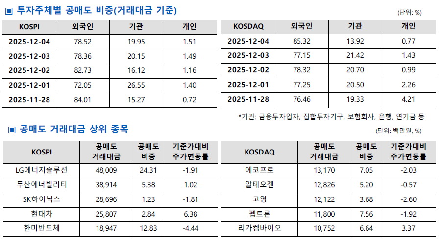 4ÀÏ ±¹³» Áõ½Ã °ø¸Åµµ °Å·¡´ë±ÝÀÌ 1Á¶¿ø¿¡ À°¹ÚÇϸç, ÀüÀϺ¸´Ù ¼ÒÆø Áõ°¡ÇÑ °ÍÀ¸·Î ³ªÅ¸³µ´Ù.Çѱ¹°Å·¡¼ÒÀÇ ¡®°ø¸Åµµ µ¥Àϸ® ºê¸®ÇÁ(2025³â 12¿ù 4ÀÏ ±âÁØ)¡¯¿¡ µû¸£¸é, À¯°¡Áõ±Ç¡¤ÄÚ½º´Ú ½ÃÀå ÇÕ»ê °ø¸Åµµ °Å·¡´ë±ÝÀº 9853¾ï¿øÀ¸·Î, Àüü °Å·¡´ë±Ý ´ëºñ ºñÁßÀº ¾à 2.97%¿´´Ù. Àü °Å·¡ÀÏ ´ëºñ °ø¸Åµµ °Å·¡´ë±ÝÀº ¾à 817¾ï¿ø ´Ã¾ú´Ù.½ÃÀ庰·Î º¸¸é, ÄÚ½ºÇÇ °ø¸Åµµ °Å·¡´ë±ÝÀº 7325¾ï¿ø, °ø¸Åµµ ºñÁßÀº 3.89%¿´´Ù. ÄÚ½º´ÚÀº 2527¾ï¿ø, ºñÁß 1.76%·Î Áý°èµÆ´Ù.ÅõÀÚÁÖüº°·Î´Â ÄÚ½ºÇÇ¿Í ÄÚ½º´Ú ¸ðµÎ °ø¸Åµµ °Å·¡´ë±Ý ±âÁØ ¿Ü±¹ÀÎ ºñÁßÀÌ 80% ¾ÈÆÆÀ» ±â·ÏÇß°í, ±â°üÀº ¾à 15~20% ¼öÁØ, °³ÀÎÀº 1~2%´Ù. °ø¸Åµµ°¡ ¿©ÀüÈ÷ ¿Ü±¹ÀÎ Á᫐ ±¸Á¶¸¦ À¯ÁöÇϰí ÀÖ´Ù´Â Àǹ̴Ù.Á¾¸ñº°·Î´Â °ø¸Åµµ °Å·¡´ë±ÝÀÌ ÄÚ½ºÇÇ¿¡¼´Â LG¿¡³ÊÁö¼Ö·ç¼Ç, µÎ»ê¿¡³Êºô¸®Æ¼, SKÇÏÀ̴нº, Çö´ëÂ÷, Çѹ̹ݵµÃ¼ µî ´ëÇüÁÖ¿Í ¹ÝµµÃ¼¡¤¿¡³ÊÁö Á¾¸ñ¿¡ ÁýÁߵƴÙ. ÄÚ½º´Ú¿¡¼´Â ¿¡ÄÚÇÁ·Î, ¾ËÅ׿ÀÁ¨, °í¿µ, ÆéÆ®·Ð, ¸®°¡Ä͹ÙÀÌ¿À µî 2Â÷ÀüÁö¿Í ¹ÙÀÌ¿À À§ÁÖ Á¾¸ñÀÌ »óÀ§±ÇÀ» Â÷ÁöÇØ ¼ºÀåÁÖ¿¡ ´ëÇÑ °ø¸Åµµ ¾Ð·ÂÀÌ µÎµå·¯Á³´Ù.°ø¸Åµµ ÀÜ°í ±âÁØÀ¸·Î´Â ÄÚ½ºÇÇ¿¡¼ LG¿¡³ÊÁö¼Ö·ç¼Ç, HDÇö´ëÁß°ø¾÷, Çѹ̹ݵµÃ¼, ¼¿Æ®¸®¿Â, Æ÷½ºÄÚǻó¿¥, ÄÚ½º´Ú¿¡¼ ¿¡ÄÚÇÁ·Î, ¿¡ÄÚÇÁ·Îºñ¿¥, HLB, ÆéÆ®·Ð, ¾ËÅ׿ÀÁ¨ µîÀÌ »óÀ§¿¡ ¿Ã¶ó ÀÖ¾î, °ø¸Åµµ ÀÜ·®µµ °°Àº ´ëÇü¡¤¼ºÀåÁÖ±º¿¡ ½×¿© ÀÖ´Â ¸ð½ÀÀÌ´Ù.ÇÑÆí Áö³ 3ÀÏ ±âÁØÀ¸·Î CJ CGV(À¯°¡Áõ±Ç)¿Í Çѱ¹±â¾÷Æò°¡, ±Û·Î¹úÅØ½ºÇÁ¸®(ÄÚ½º´Ú) µî 3°³ Á¾¸ñÀÌ °ø¸Åµµ °ú¿Á¾¸ñÀ¸·Î ÁöÁ¤µÆ´Ù.ÀüüÀûÀ¸·Î º¸¸é °ø¸Åµµ ±Ô¸ð´Â ÀüÀϺ¸´Ù ´Ã¾úÁö¸¸ ºñÁßÀº 3% ¾ÈÆÆ¿¡¼ °ü¸®µÇ°í ÀÖ°í, ¼ö±ÞÀº ¿Ü±¹ÀÎ ÁÖµµ, Á¾¸ñÀº ÀϺΠ´ëÇü¡¤¼ºÀåÁÖ¿¡ ÁýÁßµÈ ±¸Á¶°¡ Áö¼ÓµÇ°í ÀÖ´Ù. ÇØ´ç Á¾¸ñ±ºÀÇ ÁÖ°¡ º¯µ¿¼º¿¡ ´ëÇÑ ÅõÀÚÀÚ À¯Àǰ¡ ÇÊ¿äÇÑ ±¸°£À̶ó´Â Æò°¡´Ù. Áß±âÀÌÄÚ³ë¹Ì ±èÇö¼º ±âÀÚ