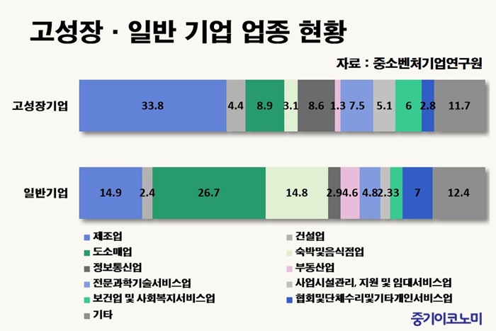 ¿ì¼± °í¼ºÀå ±â¾÷ÀÇ ¾÷Á¾ ±¸Á¶´Â ÀÏ¹Ý ±â¾÷°ú ¶Ñ·ÇÇÏ°Ô ´ëºñµÆ´Ù. ÀÏ¹Ý ±â¾÷Àº µµ¼Ò¸Å¾÷°ú ¼÷¹ÚÀ½½Ä¾÷ °°Àº ³»¼ö ¼ºñ½º¾÷ ºñÁßÀÌ ³ô¾ÒÁö¸¸, °í¼ºÀå ±â¾÷Àº Á¦Á¶¾÷, Á¤º¸Åë½Å¾÷, Àü¹®°úÇбâ¼ú¼ºñ½º¾÷ µî ±â¼ú¡¤Áö½Ä ±â¹Ý ¾÷Á¾ÀÌ Áß½ÉÀ̾ú´Ù. ±â¾÷ ±Ô¸ð°¡ Ŭ¼ö·Ï ÀÌ·¯ÇÑ °æÇâÀº ´õ °ÈµÆ°í, ¸ðµç ±Ô¸ð¿¡¼ Á¦Á¶¾÷ÀÌ °í¼ºÀå ºñÁß 1À§¸¦ Â÷ÁöÇß´Ù.