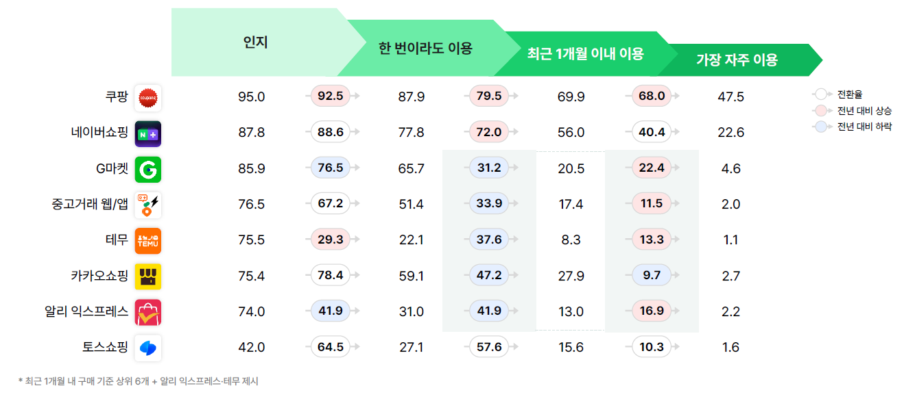 ¿ÀǼº£ÀÌ ¡®¿Â¶óÀÎ ¼îÇÎ Æ®·»µå ¸®Æ÷Æ® 2025¡¯¿¡ µû¸£¸é, ÄíÆÎ°ú ³×À̹ö¼îÇÎÀÌ ÀÎÁöµµ¡¤ÀÌ¿ë·ü¿¡¼ ¿Â¶óÀÎ ¼îÇνÃÀåÀÇ ¾ç°À» À¯ÁöÇÑ °¡¿îµ¥, 2023³â Ãâ½ÃµÈ Å佺¼îÇÎÀÌ ºü¸¥ ¼Óµµ·Î ÀÎÁö¿Í ÀÌ¿ëÀ» È®´ëÇϸç Ãß°ÝÇÏ´Â ¾ç»óÀ» º¸À̰í ÀÖ´Ù. īī¿À¼îÇÎÀº ºê·£µå ÀÎÁöµµ´Â ³ôÁö¸¸, ÀÌ¿ë °µµ¿Í ¸¸Á·µµ Ãø¸é¿¡¼´Â »ó´ëÀûÀ¸·Î ¾àÇÑ ¸ð½ÀÀ» º¸¿´´Ù.Àüü ÀÀ´äÀÚ °¡¿îµ¥ ÄíÆÎ ÀÎÁöÀ²Àº 95%, ÇÑ ¹øÀÌ¶óµµ ÀÌ¿ëÇÑ ºñÀ²Àº 87.9%, ÃÖ±Ù 1°³¿ù À̳» ÀÌ¿ëÀº 69.9%, ¡®°¡Àå ÀÚÁÖ À̿롯Àº 47.5%·Î Àü ´Ü°è¿¡¼ ÀüȯÀ²ÀÌ ³ô°Ô ³ªÅ¸³µ´Ù. ³×À̹ö¼îÇÎ ¿ª½Ã ÀÎÁö 87.8%, ÃÖ±Ù 1°³¿ù ÀÌ¿ë 56.0%·Î °ßÁ¶ÇÑ ÁöÇ¥¸¦ À¯ÁöÇϸç, ÄíÆÎ°ú ÇÔ²² ¡®Çʼö ¼îÇΠä³Î¡¯·Î ÀÚ¸®Àâ¾Ò´Ù.Å佺¼îÇÎÀº Àüü ÀÎÁöÀ²ÀÌ 42%¿¡ ±×Ä¡Áö¸¸, ÃÖ±Ù 1°³¿ù ÀÌ¿ë ÀüȯÀ²ÀÌ 57.6%·Î °æÀï»ç ´ëºñ ³ôÀº ÆíÀÎ °ÍÀ¸·Î ³ªÅ¸³µ´Ù. īī¿À¼îÇÎÀº ÀÎÁöÀ² 75.4%¿¡ ÃÖ±Ù 1°³¿ù ÀÌ¿ë ÀüȯÀ²ÀÌ 47.2%·Î, ´ëÇü Ç÷§Æû ´ëºñ ÀÚÁÖ ÀÌ¿ëÀ¸·Î À̾îÁö´Â ºñÀ²ÀÌ ³·¾Ò´Ù.Å佺¼îÇÎÀÇ Ã¹ ÀÎÁö °è±â´Â ¡®Å佺¾ÛÀ» µÑ·¯º¸´Ù ¼îÇÎ ÅÇÀ» ¹ß°ßÇß´Ù¡¯´Â ÀÀ´äÀÌ 42.4%·Î °¡Àå ¸¹¾Ò°í, ¡®°í¾çÀÌ Å°¿ì±â¡¯ °°Àº ¾Û ³» À̺¥Æ®¡¤ÇÁ·Î¸ð¼Ç, ¹è³Ê¡¤Çª½Ã ±¤°í°¡ µÚ¸¦ À̾ú´Ù. ù ±¸¸Å ÀÌÀ¯·Î´Â ¡®°¡°ÝÀÌ Àú·ÅÇØ¼¡¯, ¡®À̺¥Æ®¡¤ÇÁ·Î¸ð¼ÇÀÌ ¸¶À½¿¡ µé¾î¼¡¯°¡ »óÀ§¸¦ Â÷ÁöÇØ, ±ÝÀ¶ ¾Û ³» Æ®·¡ÇȰú °ø°ÝÀûÀÎ ÇýÅÃÀÌ Ãʱ⠼ºÀåÀÇ ÇÙ½É µ¿·ÂÀÓÀ» º¸¿©ÁØ´Ù.¿ÀǼº£ÀÌ´Â À̹ø Á¶»ç¿¡¼ ¡°ÄíÆÎÀº ¿©·¯ ǰ¸ñÀ» ÀÚÁÖ, ³×À̹ö¼îÇÎÀº ÇÑ ¹ø¿¡ °í¾×À», Å佺¼îÇÎÀº ¼Ò¾×¡¤´Üǰ À§ÁÖ·Î ±¸¸ÅÇϴ ä³Î·Î ÀÚ¸®Àâ¾Ò´Ù¡±°í Á¤¸®Çß´Ù. īī¿À¼îÇÎÀº °áÁ¦¡¤Ç÷§Æû ¿¬µ¿ °Á¡À» °¡Áø ¹Ý¸é °¡°Ý¡¤»óǰ °æÀï·Â Ãø¸é¿¡¼ °³¼± ¿©Áö°¡ ³²¾Æ ÀÖ¾î, ÇâÈÄ 4° üÁ¦ ³»¿¡¼ °¢»çÀÇ Àü·«ÀÌ ¾î¶»°Ô Â÷º°ÈµÉÁö¿¡ ½ÃÀåÀÇ °ü½ÉÀÌ ½ò¸°´Ù. Áß±âÀÌÄÚ³ë¹Ì ±èÇö¼º ±âÀÚ