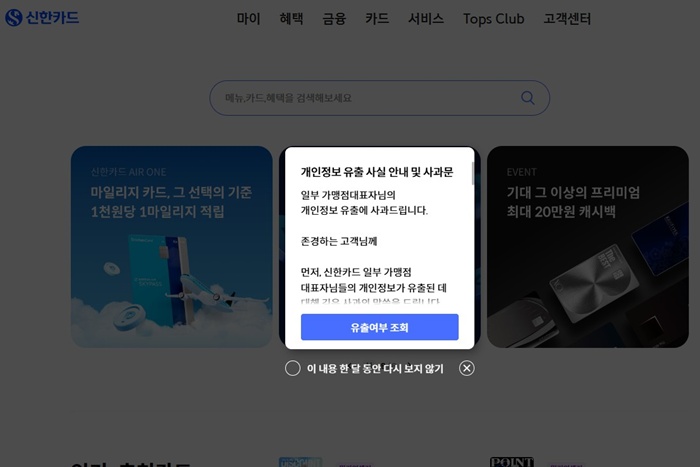 ÇöÀç±îÁö À¯Ãâ·Î ÀÎÇÑ ½ÇÁ¦ ÇÇÇØ´Â È®ÀεÇÁö ¾Ê¾ÒÀ¸³ª, ½ÅÇÑÄ«µå´Â ÇâÈÄ ÇÇÇØ°¡ ¹ß»ýÇÒ °æ¿ì Àû±ØÀûÀ¸·Î º¸»ó¿¡ ³ª¼³ °èȹÀÌ´Ù. ¾Æ¿ï·¯ ȨÆäÀÌÁö¸¦ ÅëÇØ ÇØ´ç »ç½Ç°ú »ç°ú¹®À» °Ô½ÃÇϰí, °¡¸ÍÁ¡ ´ëÇ¥ÀÚ°¡ º»ÀÎÀÇ Á¤º¸ Æ÷ÇÔ ¿©ºÎ¸¦ È®ÀÎÇÒ ¼ö ÀÖ´Â Àü¿ë ÆäÀÌÁö¸¦ ¿î¿µ ÁßÀÌ´Ù. °³º° °¡¸ÍÁ¡ ´ëÇ¥ÀÚ¿¡ ´ëÇÑ ¾È³»µµ º´ÇàÇϰí ÀÖ´Ù.