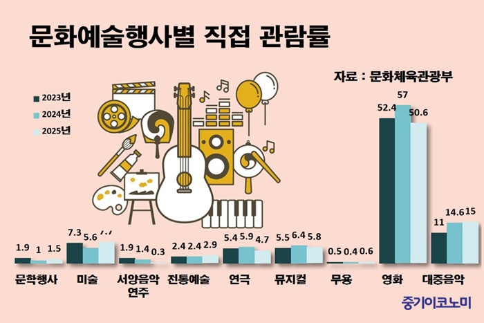 Á¶»ç °á°ú, ¹®È¿¹¼úÇà»ç¸¦ Á÷Á¢ °ü¶÷ÇÑ ºñÀ²Àº 60.2%·Î Àü³â ´ëºñ 2.8%Æ÷ÀÎÆ® °¨¼ÒÇß´Ù. ¿µÈ °ü¶÷·ü Ç϶ôÀÇ ¿µÇâÀÌ ÄÇ´Ù. ¿µÈ´Â ¿©ÀüÈ÷ °¡Àå ³ôÀº °ü¶÷·ü(50.6%)À» ±â·ÏÇßÁö¸¸ Àü³âº¸´Ù 6.4%Æ÷ÀÎÆ® ÁÙ¾ú´Ù. ¹Ý¸é ´ëÁßÀ½¾Ç°ú ¿¬¿¹, ¹Ì¼ú ºÐ¾ß °ü¶÷·üÀº ¼ÒÆø »ó½ÂÇß´Ù. Á÷Á¢ °ü¶÷ Ƚ¼ö ¿ª½Ã Æò±Õ 2.4ȸ·Î Àü³âº¸´Ù ÁÙ¾ú´Ù.