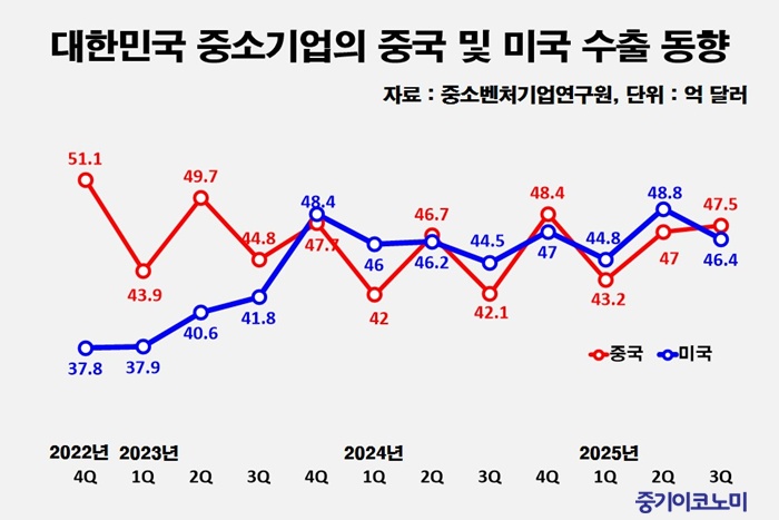 ¡ÞÁß¼Ò±â¾÷ ¼öÃâ ¡®Å»Áß±¹¡¤¹Ì±¹Ç࡯ °¡¼ÓÈ­=±â¾÷°æ¿µ ºÐ¾ß¿¡¼­´Â Áß¼Ò±â¾÷ ¼öÃⱸÁ¶ ´Ùº¯È­°¡ °¡Àå Áß¿äÇÑ °úÁ¦·Î Á¦½ÃµÆ´Ù. 2025³â 3ºÐ±â ±âÁØ ´ë¹Ì ¼öÃâ¾×Àº 2022³â ¸» ´ëºñ 22.8% Áõ°¡ÇÑ ¹Ý¸é, ´ëÁß ¼öÃâÀº 7.0% °¨¼ÒÇß´Ù. ¹Ì±¹ÀÇ ¡®¹Ì±¹ ¿ì¼±ÁÖÀÇ¡¯¿Í Áß±¹ÀÇ ¡®½Ö¼øÈ¯¡¯ Àü·« µî ÀÚ±¹ ¿ì¼±ÁÖÀÇ Á¤Ã¥ÀÌ °­È­µÇ¸é¼­, ¿ì¸® Áß¼Ò±â¾÷ÀÇ ÀÔÁöµµ º¯È­Çϰí ÀÖ´Ù.