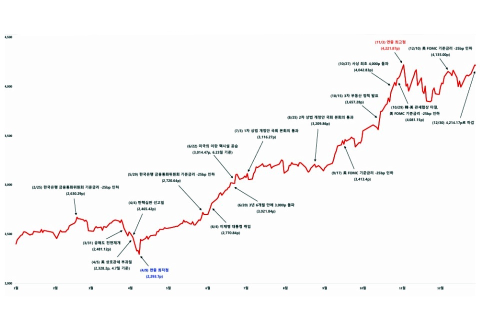 Çѱ¹°Å·¡¼Ò¿¡ µû¸£¸é 12¿ù 30ÀÏ ±âÁØ ÄÚ½ºÇÇ Áö¼ö´Â Àü³â ¸» ´ëºñ 75.6% »ó½ÂÇÑ 4214.17Æ÷ÀÎÆ®·Î °Å·¡¸¦ ¸¶ÃÆ´Ù. 2022³â ÀÌÈÄ ºÎÁøÇß´ø È帧À» ¹þ¾î³ª ´Ü¼û¿¡ ¿ª´ë ÃÖ°íÄ¡¸¦ °æ½ÅÇÑ °ÍÀÌ´Ù. ¿¬ÃÊ¿¡´Â Á¤Ä¡Àû ºÒÈ®½Ç¼º°ú ¹Ì±¹ »óÈ£°ü¼¼ ¿ì·Á µî ´ë³»¿Ü º¯¼ö·Î 2293Æ÷ÀÎÆ®±îÁö ¹Ð¸®±âµµ ÇßÁö¸¸, »õ Á¤ºÎ Ãâ¹ü ÀÌÈÄ ÁÖÁÖ°¡Ä¡ Á¦°í¿Í ºÒ°øÁ¤°Å·¡ ±ÙÀýÀ» °ñÀÚ·Î ÇÑ ÀÚº»½ÃÀå Ȱ¼ºÈ Á¤Ã¥ÀÌ º»°ÝÈµÇ¸é¼ ÅõÀڽɸ®°¡ ºü¸£°Ô ȸº¹µÆ´Ù.