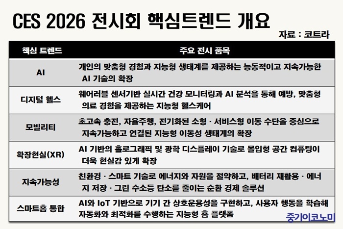 ÄÚÆ®¶ó´Â Áö³ÇØ 12¿ù ¡®CES ¹Ì¸®º¸±â¡¯ °¡À̵带 »çÀü ¹ß°£ÇØ 2026³â Àü½Ã ±¸¼º°ú ÁÖ¸ñ ±â¾÷À» ¼Ò°³Çß´Ù. AI ±â¹Ý ¾÷¹«ÀÚµ¿È Ç÷§ÆûÀ¸·Î Çõ½Å»óÀ» ¼ö»óÇÑ ±â¾÷À» ºñ·ÔÇØ °Ç¼³¡¤»ê¾÷±â¼úÀ» À¶ÇÕÇÑ »ê¾÷ AI ºÐ¾ß Âü°¡±â¾÷ÀÌ 50¿© °³»ç¿¡ À̸¥´Ù. KºäƼ ÃÖ´ë ½ÃÀåÀÎ ¹Ì±¹À» °Ü³ÉÇÑ ºäƼÅ×Å© ±â¾÷ 24°³»çÀÇ È°¾àµµ ±â´ëµÈ´Ù.