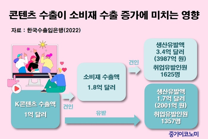 ¡ÞIP È®»ê±¸Á¶ ÀüÁ¦ ¡®ÄÜÅÙÃ÷ ÅõÀÚ 2.0¡¯=¹Ý¸é ÄÜÅÙÃ÷ »ê¾÷ÀÌ Ã¢ÃâÇÏ´Â °æÁ¦Àû ÆÄ±Þ È¿°ú´Â »ê¾÷ ¿ÜºÎ¿¡¼ Å©°Ô ³ªÅ¸³´Ù. º¸°í¼´Â ÄÜÅÙÃ÷ ¼öÃâ 1¾ï ´Þ·¯ Áõ°¡ ½Ã °ü·Ã ¼ÒºñÀç ¼öÃâÀÌ ¾à 1¾ï 8000¸¸ ´Þ·¯ È®´ëµÇ°í, »ý»ê¡¤°í¿ë À¯¹ß È¿°ú ¿ª½Ã »ó´çÇÑ ±Ô¸ð·Î ³ªÅ¸³´Ù°í ºÐ¼®Çß´Ù. K-ÄÜÅÙÃ÷´Â ±× ÀÚüÀÇ ¸ÅÃ⺸´Ù ÈÀåǰ¡¤½Äǰ¡¤ÆÐ¼Ç¡¤°ü±¤ µî ¿¬°ü »ê¾÷À¸·Î ¼Òºñ¸¦ È®»ê½ÃŰ´Â ¡®Æ®¸®°Å¡¯ ¿ªÇÒÀ» ¼öÇàÇϰí ÀÖ´Ù´Â ¼³¸íÀÌ´Ù.