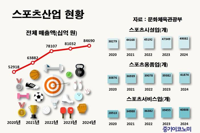 ¹®ÈüÀ°°ü±¤ºÎ°¡ 8ÀÏ ¹ßÇ¥ÇÑ ¡®2024³â ±âÁØ ½ºÆ÷Ã÷»ê¾÷Á¶»ç¡¯ °á°ú¿¡ µû¸£¸é, ±¹³» ½ºÆ÷Ã÷»ê¾÷ ¸ÅÃâ¾×ÀÌ 84Á¶ 7000¾ï ¿øÀ» ±â·ÏÇÏ¸ç ¿ª´ë ÃÖ´ëÄ¡¸¦ °æ½ÅÇß´Ù. ÀÌ´Â Àü³â ¸ÅÃâ¾×ÀÎ 81Á¶ ¿øº¸´Ù 4.5% Áõ°¡ÇÑ ¼öÄ¡·Î, Äڷγª19·Î À§ÃàµÆ´ø »ê¾÷ ±Ô¸ð°¡ 2020³â ÀÌÈÄ 5³â ¿¬¼Ó ¼ºÀå¼¼¸¦ À̾°í ÀÖ´Ù.