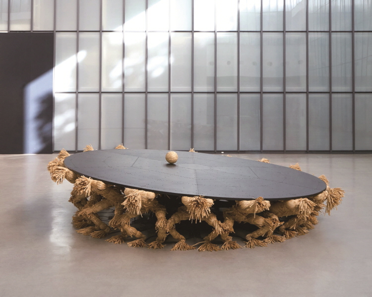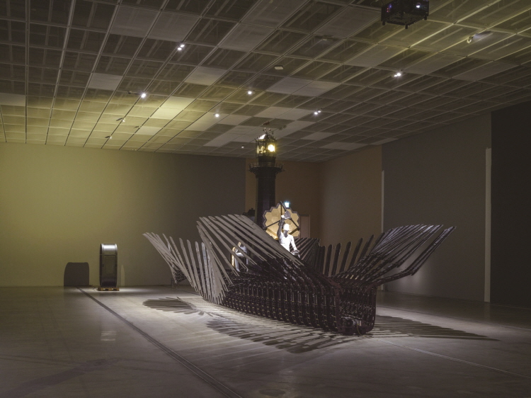 ¿¹¸¦ µé¾î, °ËÀº öÁ¦ ÇÁ·¹ÀÓ¿¡ Èò»öÀÌ Ä¥ÇØÁø ÆóÁ¾À̸¦ µ¡´í 35½ÖÀÇ ³ë°¡ µµ¿ÇÑ 12¹ÌÅÍÀÇ °Å´ëÇÑ ¡®ÀÛÀº ¹æÁÖ¡¯(2022)ÀÇ ³»ºÎ¿¡´Â ÆÄ³ñƼÄÜ ¿ªÇÒÀ» ÇÏ´Â ¡®µî´ë¡¯¿Í ¹Ý´ë¹æÇâÀ» ÇâÇϰí ÀÖ´Â ¡®µÎ ¼±À塯, ¿ìÁÖ ¸Á¿ø°æ ¡®Á¦ÀÓ½º À¥¡¯ÀÌ ¹èÄ¡µÇ¾î ÀÖ´Ù. ¹æÁÖ ¿·¿¡´Â ¿¬°áµÇ¾ú´ÂÁö ²÷¾îÁø °ÍÀÎÁö ¸ð¸¦ ¡®´é¡¯ÀÌ º®¿¡ ¹ÚÇôÀÖ°í, ¹î¸Ó¸® Àå½ÄÀÎ, Ãà óÁø ¡®Ãµ»ç¡¯°¡ õÀå¿¡ ¸Å´Þ·Á ÀÖ´Ù. ÇÑÂÊ ¹î¸Ó¸®¿¡´Â ¹«ÇÑÈ÷ ÁõÆøµÇ´Â °ø°£À» º¸¿©ÁÖ´Â ¡®¹«ÇÑ °ø°£¡¯(2022)ÀÌ, ¹Ý´ëÂÊ ¹î¸Ó¸®¿¡´Â ²÷ÀÓ¾øÀÌ »õ·Î¿î ¹®ÀÌ ¿¸®´Â ¿µ»ó ¡®Ãⱸ¡¯°¡ »ó¿µµÈ´Ù(¡®ÀÛÀº ¹æÁÖ¡¯´Â ¾çÂÊ ¾îµð°¡ ¹î¸Ó¸®ÀÎÁö ¾Ë ¼ö ¾ø´Ù.) ¹æÁÖ¿Í ±× ³»ºÎ, ±×¸®°í ÁÖº¯ÀÇ ÀÛ¾÷µéÀº °¢°¢ ´ÜÀÏü·Î Àǹ̸¦ Áö´Ï¸é¼µµ, ȸÁýü°¡ µÊÀ¸·Î½á ÇϳªÀÇ °Å´ë ±â°è¸¦ ¿Ï¼ºÇÑ´Ù.